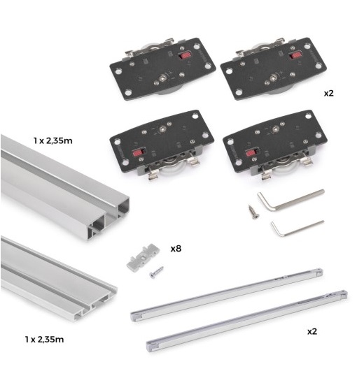 Μηχανισμός συρόμενης δίφυλλης ντουλάπας Flow 2 της Emuca σε kit κατάλληλο για ξύλινες πόρτες. Το kit περιλαμβάνει τους οδηγούς πάνω και κάτω με μέγιστο μήκος 2350mm, τα ράουλα για δύο πόρτες και δύο φρένα για να κλείνουν οι πόρτες απαλά. Το μέγιστο βάρος ανά πόρτα είναι τα 30kg, καθώς τα ράουλα είναι κατασκευασμένα από χάλυβα και ισχυρό πλαστικό, κάτι το οποίο τα κάνει ανθεκτικά σε βάρος και πίεση. Επιπλέον μπορούν να ρυθμιστούν σε ύψος +-9mm περιστρέφοντας μία βίδα στο επάνω μέρος τους. Ο μηχανισμός Flow 2 της Emuca είναι διαθέσιμος σε μαύρη και ασημί απόχρωση, είναι ισπανικής προέλευσης και συνοδεύεται από 2 χρόνια εργοστασιακή εγγύηση.