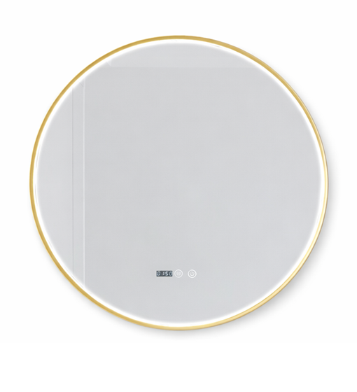 Φωτιζόμενος στρογγυλός καθρέφτης μπάνιου led αφής Mirrorlux Callisto με χρυσό μεταλλικό πλαίσιο. Διαθέτει μοντέρνο και minimal σχεδιασμό δίνοντας στο μπάνιο σας την πολυτέλεια που του αρμόζει. Διαθέτει διακόπτες αφής και αντιθαμβωτική λειτουργία, κάνοντας τη χρήση του απλή και άνετη, καθώς επίσης και οθόνη ένδειξης ώρας προσθέτοντας πρακτικότητα στο χώρο σου. Η τεχνολογία Copper Free προστατεύει τις ακμές και αποτρέπει μαύρα στίγματα, εξασφαλίζοντας μεγαλύτερη αντοχή και διάρκεια στον χρόνο. Με προσεγμένη κατασκευή, αδιαβροχοποίηση IP44 και υψηλής ποιότητας υλικά, κάθε MirrorLux καθρέφτης με το δικό του μοναδικό όνομα φέρνει φως, κομψότητα και πολυτέλεια σε κάθε χώρο. Κάθε καθρέφτης MirrorLux είναι σχεδιασμένος για να προσφέρει μια ολοκληρωμένη εμπειρία ομορφιάς και φροντίδας. Με φωτισμό Led Smd 2835 υψηλής απόδοσης, 120 leds ανά μέτρο και ρυθμιζόμενη απόχρωση φωτός από θερμό 2700k έως ψυχρό 6500k, κάθε λεπτομέρεια φαίνεται ξεκάθαρα κάνοντας τις συνθήκες ιδανικές για μακιγιάζ και καθημερινή περιποίηση στο ανώτατο βαθμό.
