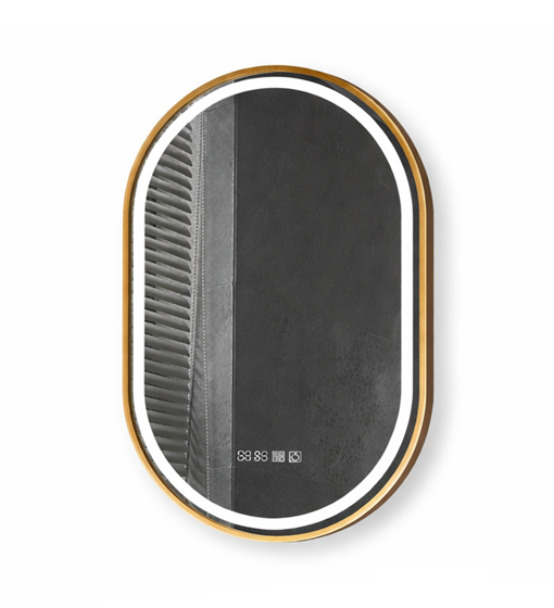 Φωτιζόμενος οβάλ καθρέφτης μπάνιου led αφής Mirrorlux Helios με χρυσό μεταλλικό πλαίσιο. Διαθέτει μοντέρνο και minimal σχεδιασμό δίνοντας στο μπάνιο σας την πολυτέλεια που του αρμόζει. Διαθέτει διακόπτες αφής και αντιθαμβωτική λειτουργία, κάνοντας τη χρήση του απλή και άνετη, καθώς επίσης και οθόνη ένδειξης ώρας προσθέτοντας πρακτικότητα στο χώρο σου. Η τεχνολογία Copper Free προστατεύει τις ακμές και αποτρέπει μαύρα στίγματα, εξασφαλίζοντας μεγαλύτερη αντοχή και διάρκεια στον χρόνο. Με προσεγμένη κατασκευή, αδιαβροχοποίηση IP44 και υψηλής ποιότητας υλικά, κάθε MirrorLux καθρέφτης με το δικό του μοναδικό όνομα φέρνει φως, κομψότητα και πολυτέλεια σε κάθε χώρο. Κάθε καθρέφτης MirrorLux είναι σχεδιασμένος για να προσφέρει μια ολοκληρωμένη εμπειρία ομορφιάς και φροντίδας. Με φωτισμό Led Smd 2835 υψηλής απόδοσης, 120 leds ανά μέτρο και ρυθμιζόμενη απόχρωση φωτός από θερμό 2700k έως ψυχρό 6500k, κάθε λεπτομέρεια φαίνεται ξεκάθαρα κάνοντας τις συνθήκες ιδανικές για μακιγιάζ και καθημερινή περιποίηση στο ανώτατο βαθμό.