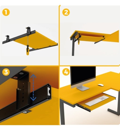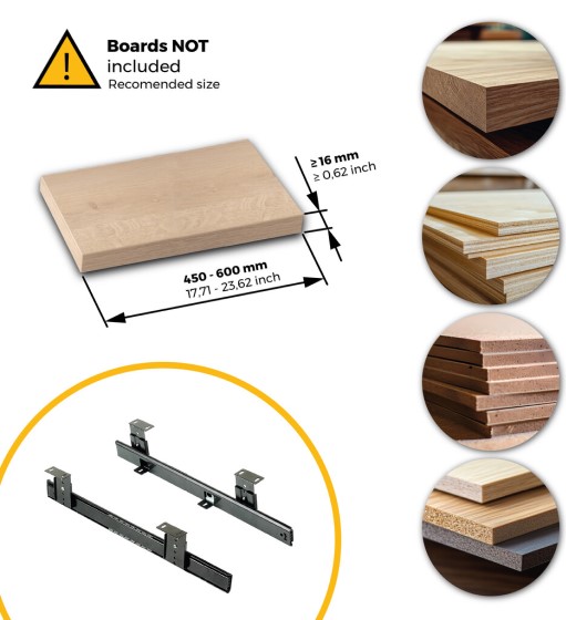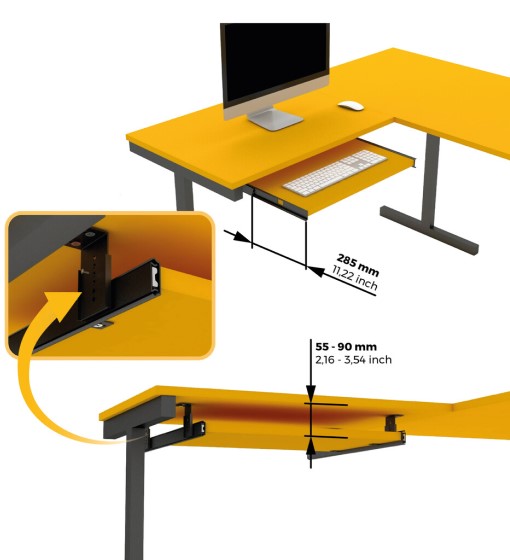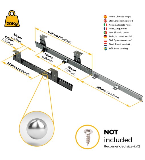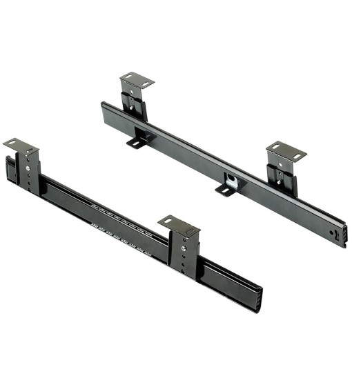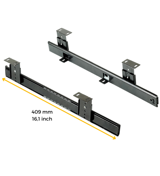 Οδηγός συρταριού πληκτρολογίου επεκτεινόμενος μαύρος με μπίλιες σε διάσταση 409mm. Είναι σχεδιασμένος για εντατική χρήση σε γραφεία και άλλου είδους έπιπλα. Διαθέτει 6 θέσεις ρύθμισης του ύψους ανάλογα με τις ανάγκες της εκάστοτε περίπτωσης. Η τοποθέτηση γίνεται στην κάτω πλευρά του γραφείου ή της κατασκευής σας. Είναι κατασκευασμένο από ισχυρό κράμα μετάλλου κάτι το οποίο κάνει το σετ οδηγών ανθεκτικό σε βάρος έως 20kg και πίεση. Το σετ περιλαμβάνει 2 οδηγούς για την δεξιά και αριστερή πλευρά. Είναι της Emuca ισπανικής κατασκευής και διαθέτει 2 χρόνια εργοστασιακή εγγύηση.