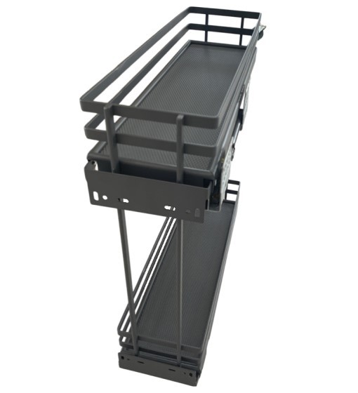 Το βαγονέτο με μεταλλικό πάτο και ενσωματωμένο αντιολισθητικό χαλάκι της Finetto ιταλικής κατασκευής κατατάσσεται στην κορυφή όλων των συστημάτων αποθήκευσης. Αποτελεί την ιδανική λύση για κουζίνες που θέλετε να αποθηκεύσετε μπουκάλια και άλλα αντικείμενα σε στενά ερμάρια. Το ανθρακί φινίρισμα του ταιριάζει με όλους τους χρωματισμούς κουζίνας. Η υψηλή ποιότητα υλικού κατασκευής είναι το κύριο χαρακτηριστικό του, έχοντας μέγιστη αντοχή βάρους έως 40kg, καθώς διαθέτει ενισχυμένο οδηγό. Το βαγονέτο της Finetto συνοδεύεται από δύο χρόνια εργοστασιακή εγγύηση.