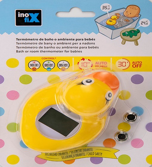 Το ψηφιακό θερμόμετρο “Πάπια” για το μπάνιο είναι ο καλύτερος σύντροφος για τα παιδιά σας στην ώρα του μπάνιου. Με τον χαριτωμένο σχεδιασμό της πάπιας και την ακριβή ψηφιακή μέτρηση της θερμοκρασίας του νερού, παρέχει ασφάλεια και διασκέδαση. Επιπλέον, η εύκολη χρήση και η φιλική προς το παιδί σχεδίασή του καθιστούν το μπάνιο μια ευχάριστη εμπειρία για τους μικρούς μας φίλους. Το θερμόμετρο είναι της Inofix ισπανικής κατασκευής.