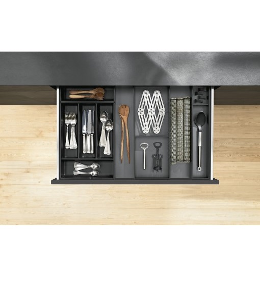 Η κορνίζα διαχωριστική κουζίνας Ambia-line της Blum διαθέτει εντυπωσιακό λεπτό σχεδιασμό και παρέχει μία εντυπωσιακή έννοια τάξης δίνοντας καλαίσθητες πινελιές στο εσωτερικό των νέων συρταριών Legrabox . Η κατασκευή της είναι ιδανική για τη τοποθέτηση μαχαιροπίρουνων και άλλων εργαλείων. Ο σχεδιασμός της είναι απόλυτα λειτουργικός καθώς εξοικονομεί αρκετό χώρο και οι διαστάσεις της είναι 200mm φάρδος και 500mm μήκος. Το ανθρακί φινίρισμα της ταιριάζει απόλυτα με όλους τους χρωματισμούς κουζίνας δίνοντας μία πρόσθετη λάμψη στο εσωτερικό των συρταριών και η επιφάνεια soft touch θα σας συναρπάσει. Τα οριζόντια διαχωριστικά που διαθέτει μπορούν να τοποθετηθούν σε οποιοδήποτε σημείο της κορνίζας εσείς επιθυμείτε ανάλογα με τις ανάγκες σας. Η διαχωριστική κορνίζα Ambia-line της Blum είναι αυστριακής κατασκευής και συνοδεύεται από πέντε χρόνια εργοστασιακή εγγύηση.