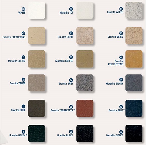 | Χρώμα | Cappuccino, Celtic Stone, Granite Beige, Granite Black, Granite Blue, Granite Green, Granite Grey, Granite Rust, Granite Sand, Granite Taupe, Granite Terracota, Granite White, Metallic Coffee, Metallic Cream, Metallic Ice, Metallic Silver, Metallic Space, Λευκό |